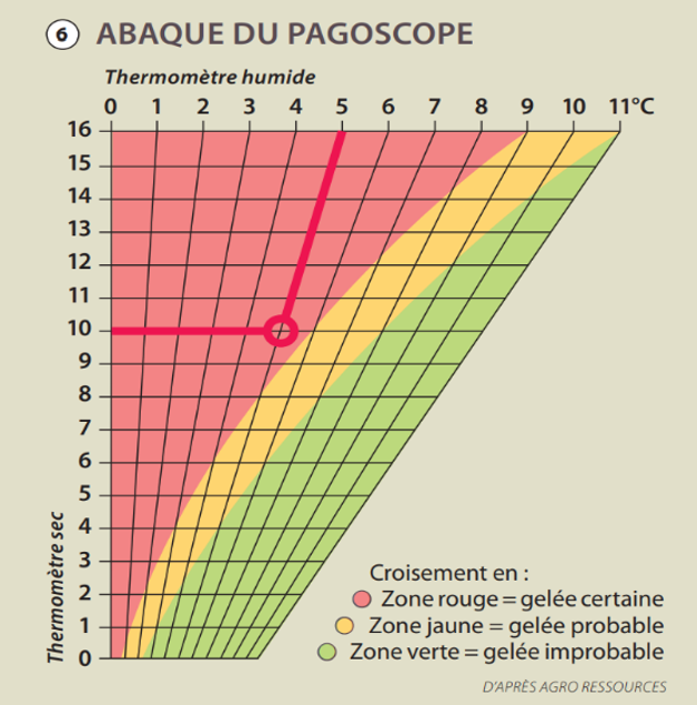 En période à risque, des mesures sont à réaliser sur l’exploitation et dans des parcelles de références connues pour leur niveau d’exposition au gel. Selon le principe du pagoscope (Bernel-Bourette), les mesures enregistrées sur un psychromètre au coucher du soleil sont des indicateurs du risque de gelée la nuit suivante. Le risque de gel lu sur l’abaque du pagoscope met en relation ces températures avec le point de rosée.