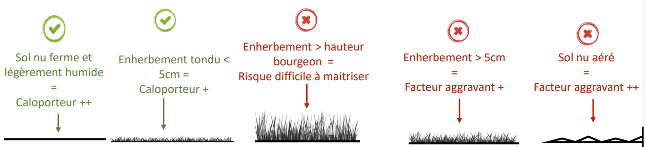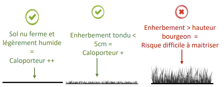 - Un couvert > 5cm sera de 1 à 3°C inférieur à un sol nu. La situation a tendance à s’inverser dans une moindre mesure après quelques jours de rayonnement solaire faible et/ou de vents forts.