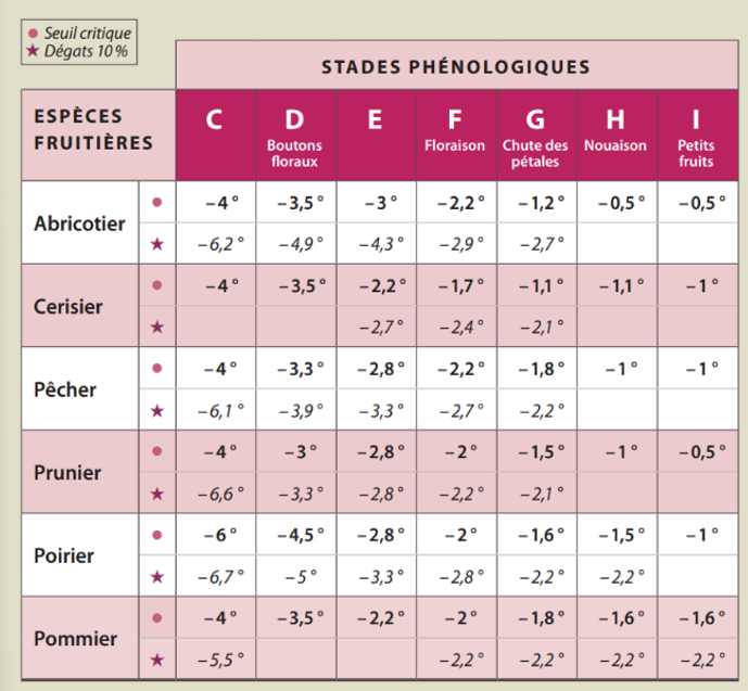 Avoir une bonne connaissance des seuils de sensibilité des végétaux, en fonction des stades végétatifs, est primordial. Comme observé au cours des épisodes gélifs du mois d’avril 2021, les dégâts ont été importants sur plusieurs espèces à différents stades. Les variétés à débourrement tardif, encore situées aux stades D-E, ont été moins pénalisées par le gel