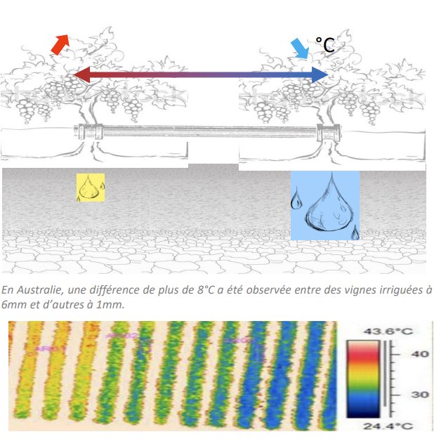 La disponibilité en eau du sol permet de réduire de plusieurs degrés la température du feuillage. En effet, la perte d'eau par les stomates ouverts a un effet de refroidissement sur la végétation et l'environnement. Les expériences menées dans différents vignobles exposés à des vagues de chaleur ont montré de grandes différences de température de la végétation en fonction des quantités d’eau apportées. Les vignes qui transpirent contribueront donc au refroidissement du vignoble. Il est important de commencer à irriguer avant la vague de chaleur pour éviter d’être pris de court lorsque l’évènement arrive. En effet, en général en période de forte chaleur, compenser l’évapotranspiration par une irrigation de dernière minute s’avèrera infructueux.